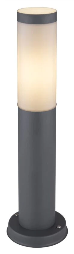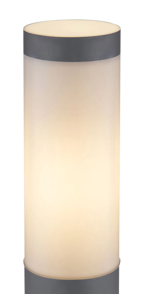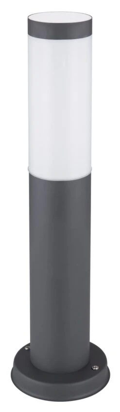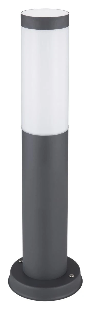 Diese 450mm große Außensockelleuchte ist in elegantem anthrazit gehalten. Der Zylinder bestehend aus Edelstahl und einem opalen Kunststoffschirm wird von einem Sockel getragen, welchen man problemlos auf ebener Fläche montieren kann.