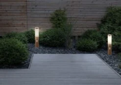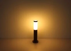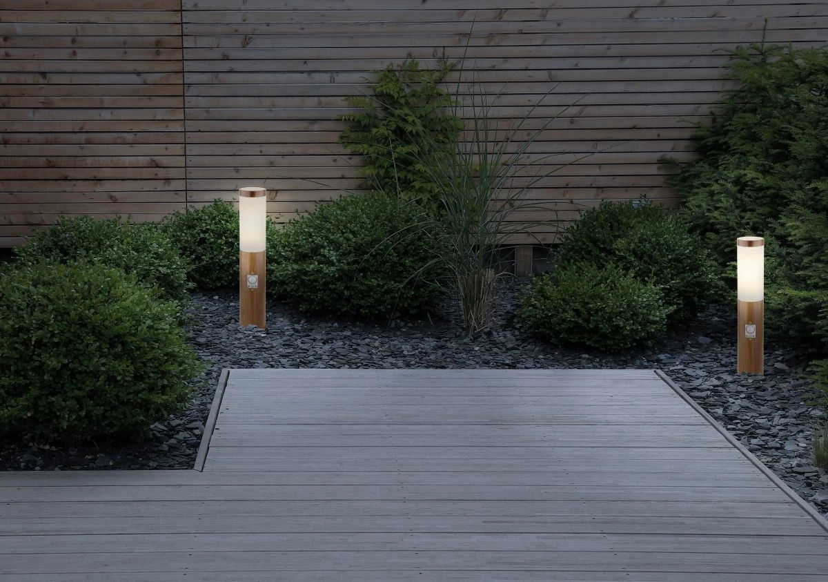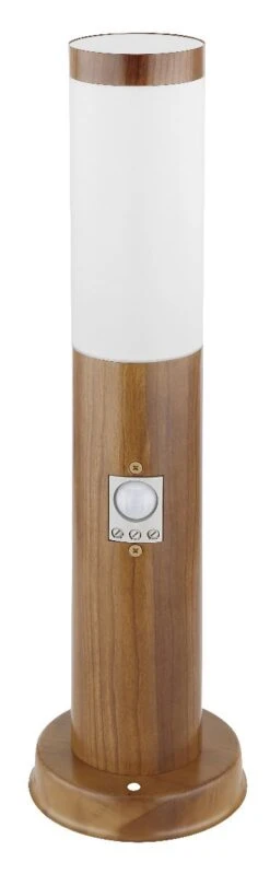 Diese 450mm große Außensockelleuchte ziert eine moderne Holzoptik. Der Zylinder, bestehend aus holzfarben gestyltem Edelstahl und einem opalen Kunststoffschirm, wird von einem Sockel getragen, welchen man problemlos auf ebener Fläche montieren kann. Zusätzlich verfügt die Leuchte über einen Sensor, welcher bei Bewegung reagiert. Unter dem opalen Schirm befindet sich eine E27 Fassung, welche Sie mit Ihrem passenden Leuchtmittel bestücken können. Nutzen Sie die Chance Ihre ideale Lichtfarbe und Helligkeit selbst zu bestimmen.