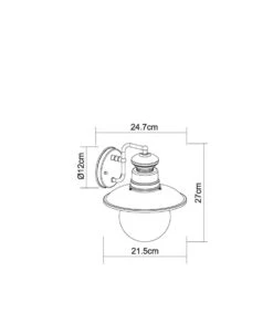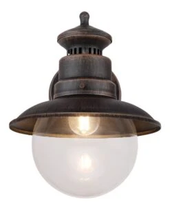 Die Wandleuchte Sella für den Außenbereich ist dem traditionellen Stil nachempfunden und erinnert leicht an alte Gaslaternen. Der geschwungene Arm aus rostfarbenem Stahl trägt einen 21,5cm großen Metallschirm unter dem sich eine klare Glaskugel befindet – ein äußerst gelungener Entwurf einer Außenwandlampe .