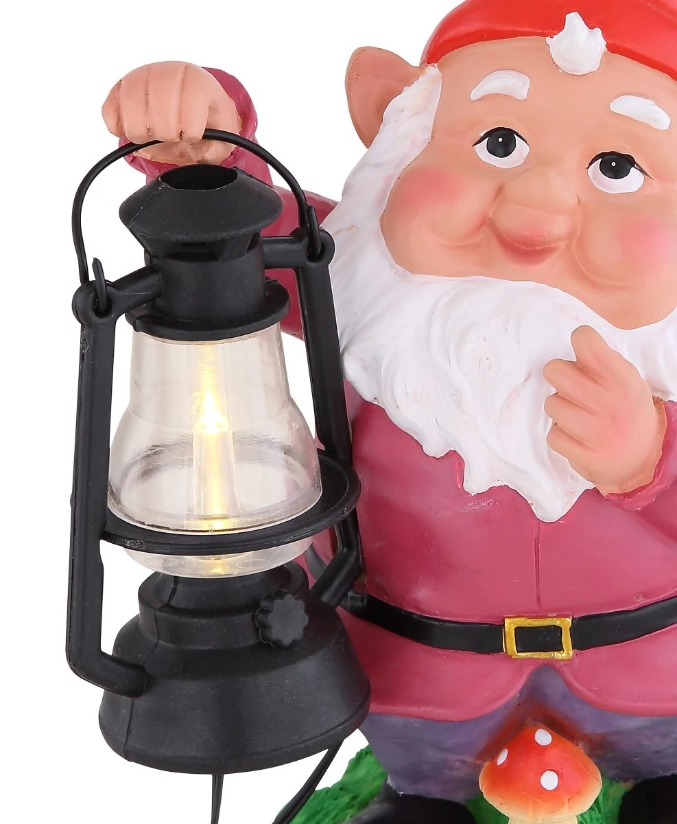 Diese 255mm hohe Statue in Form eines fröhlich bunten Gartenzwerges wurde aus Kunststoff gefertigt. Sie eignet sich perferkt um ein stimmungsvolles Ambiente im Garten zu erzeugen. In seiner rechten Hand hält der kleine muntere Geselle eine schwarze Laterne, welche ab Dämmerung für ein stimmungsvolles Licht sorgt. Sie erhalten hier ein attraktives Lichtobjekt, welches völlig autark betrieben werden kann – dank verbautem Solarmodul.