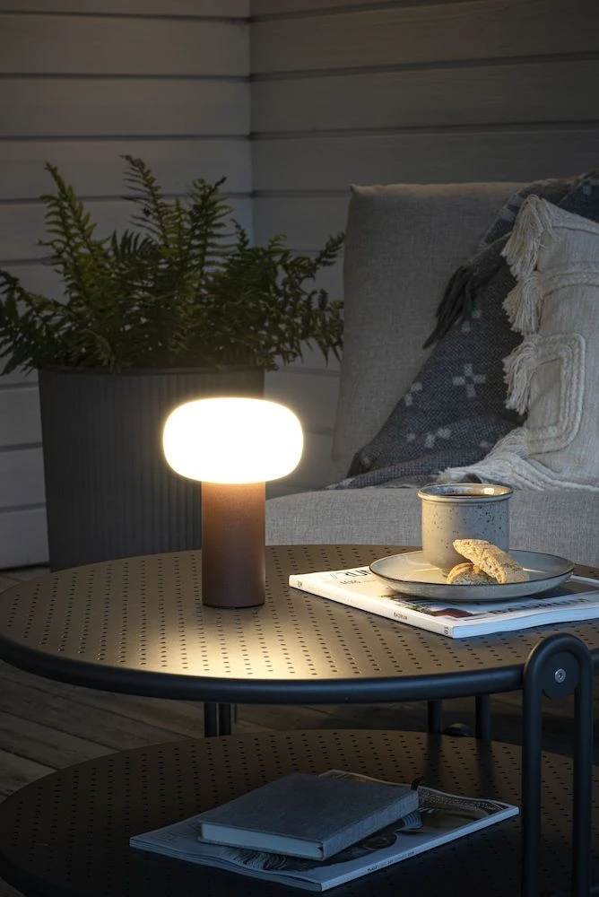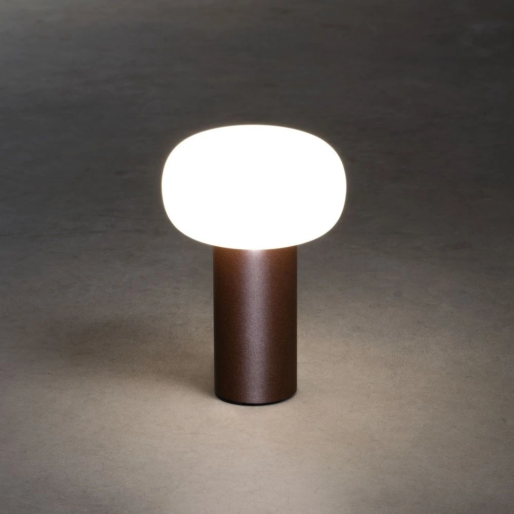 Die portable Tischlampe Antibes von Konstsmide lässt sich ganz einfach am zylinderförmigen rostfarbenen Aluminiumsockel packen und umsetzen. Möglich macht dies der inkludierte Akku. Dieser kann mittels im Lieferumfang enthaltener USB-Ladestation geladen werden. Verwenden Sie bitte einen Adapter DC 5V mit max. 3A (Adapter nicht enthalten). Ein weiteres Highlight der Leuchte ist die enthaltende LED, welche dimmbar ist, die Lichtfarbe in 2700, 3000 oder 4000K wechseln kann und über RGB Farben verfügt. Wählen Sie Ihr perfektes Licht für jede Situation. Antibes ist mittels Knopf am Sockel bedienbar. Schalten Sie die Tischleuchte mit einem kurzen Drücken des Knopfes ein und halten Sie den Knopf gedrückt um Ihr Lichtprodukt abzudunkeln und erneut gedrückt halten um aufzuhellen. Alle weiteren Funktion ergeben sich nach langem oder kurzem Drücken des gleichen Knopfes.