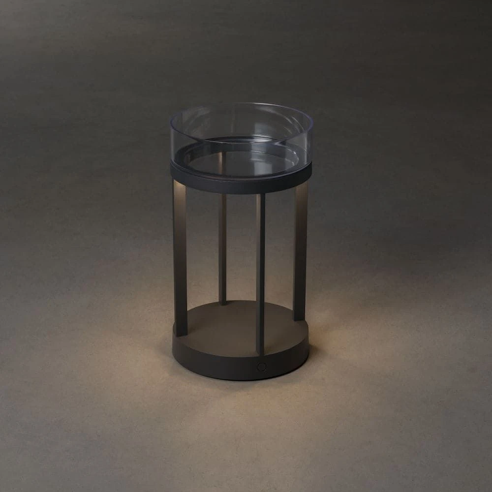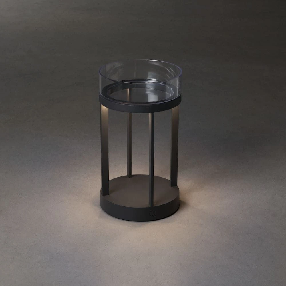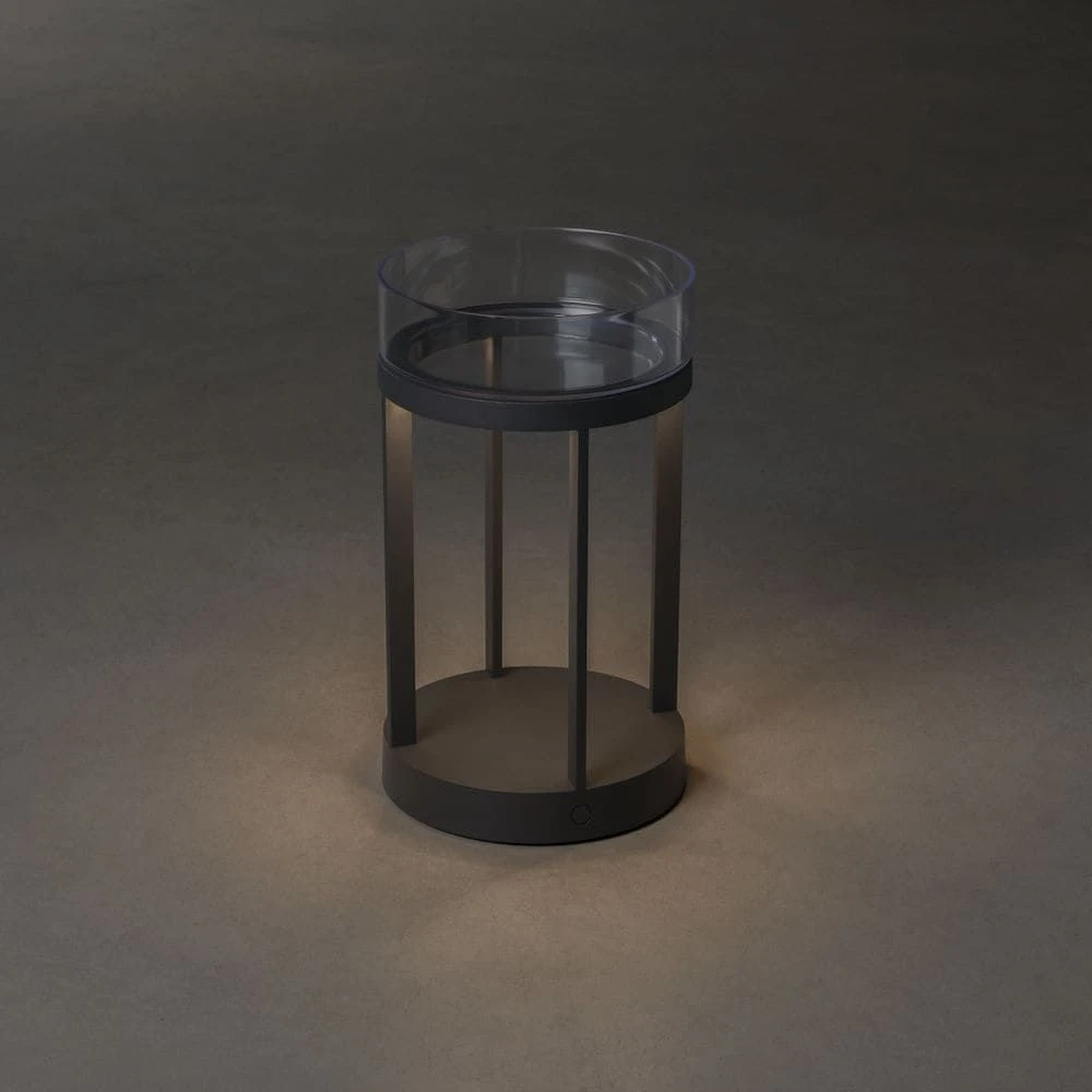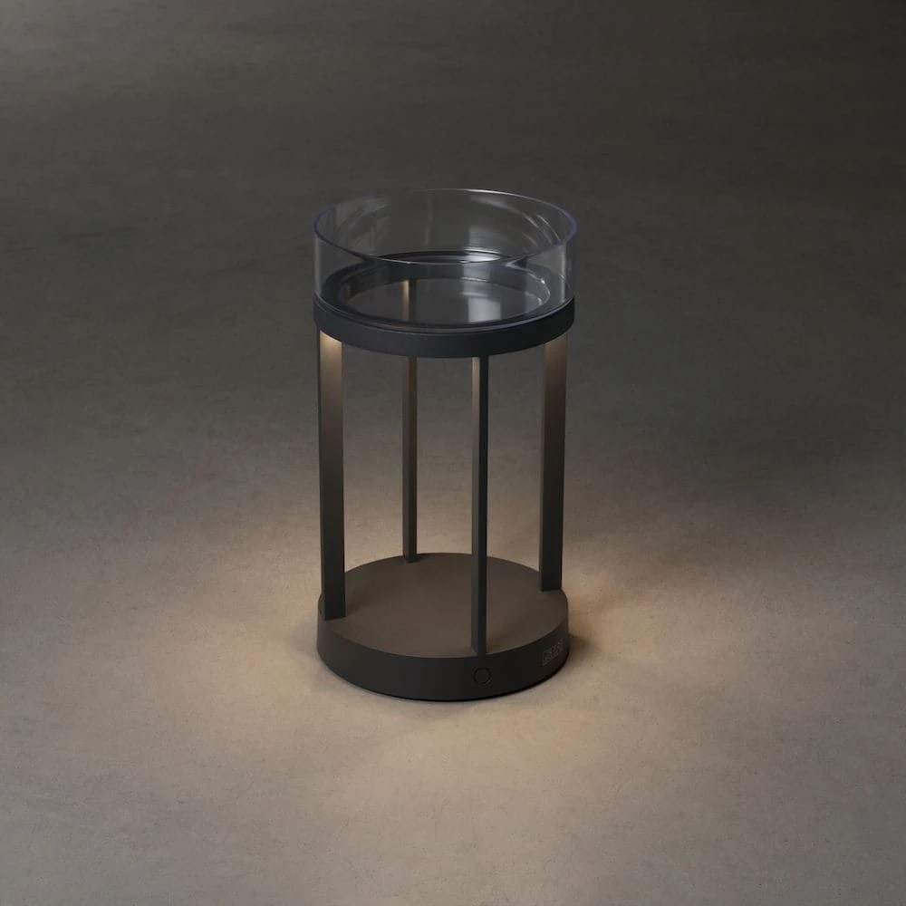 Die attraktive Optik im runden Laternen-Stil ist made by Konstsmide. Der Hersteller hat der LED-Leuchte einen weiteren Pluspunkt verschafft, indem diese mit einer abnehmbaren Glasschale oberhalb ausgestattet wurde. Diese können Sie gern mit Dekomaterial befüllen und Ihrer Umgebung noch mehr Charakter verleihen. Achten Sie bei der Umplatzierung darauf, die Glasschale vorher von der Lampe zu nehmen, da diese sonst herunter fallen könnte. Abnehmbares Glas lässt sich dafür leichter reinigen.