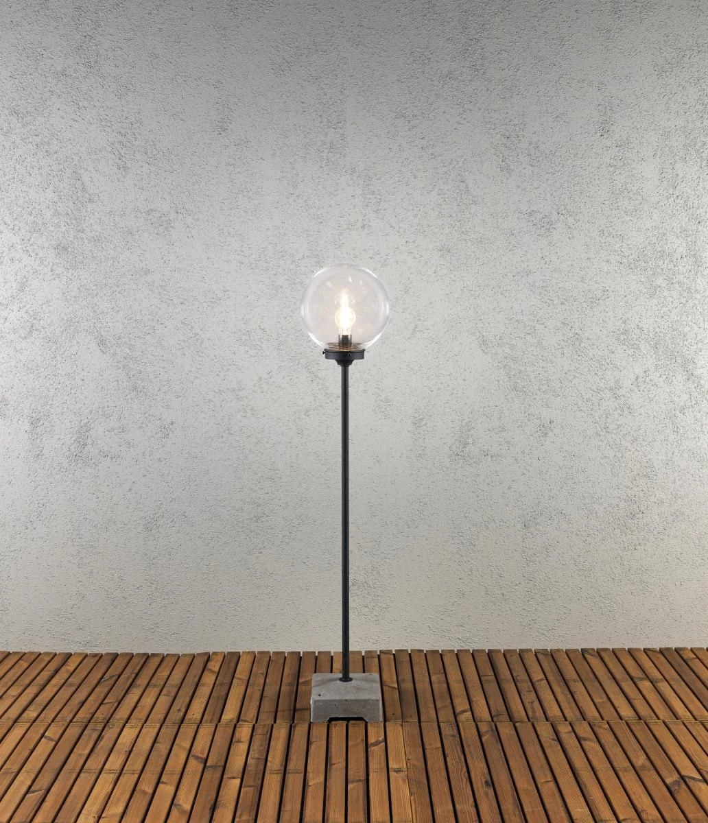 Materialbeschreibung: schwarz lackiertes Aluminium, massiver Betonfuß, runder Acrylglas Aufsatz