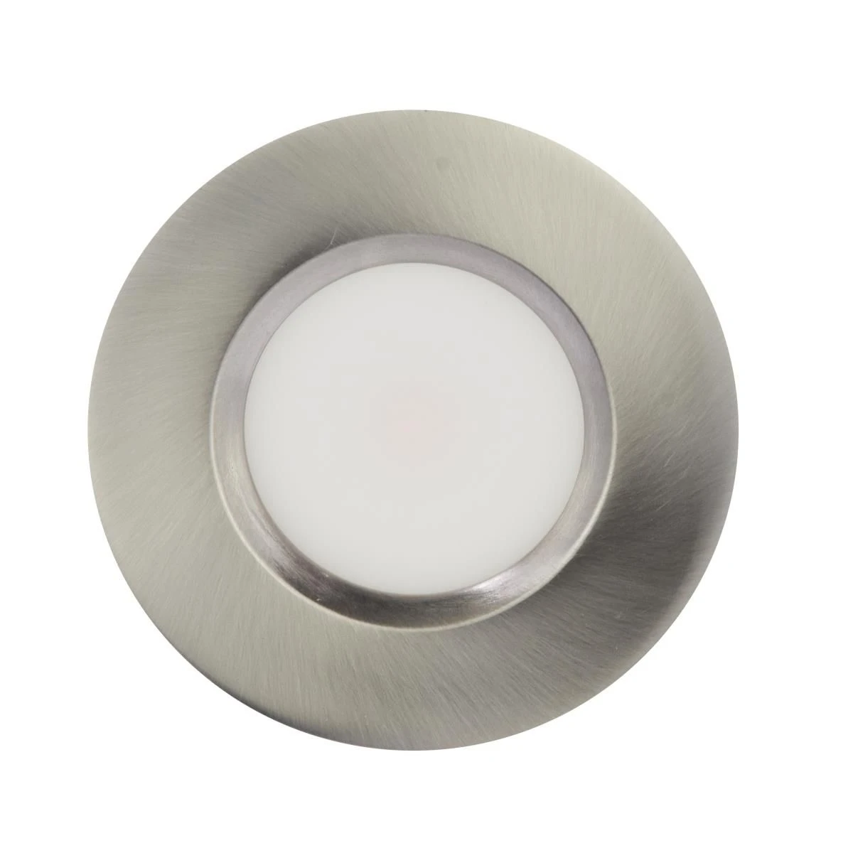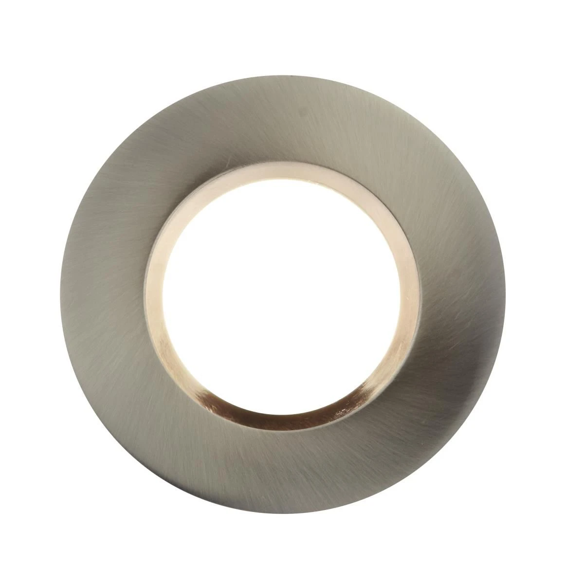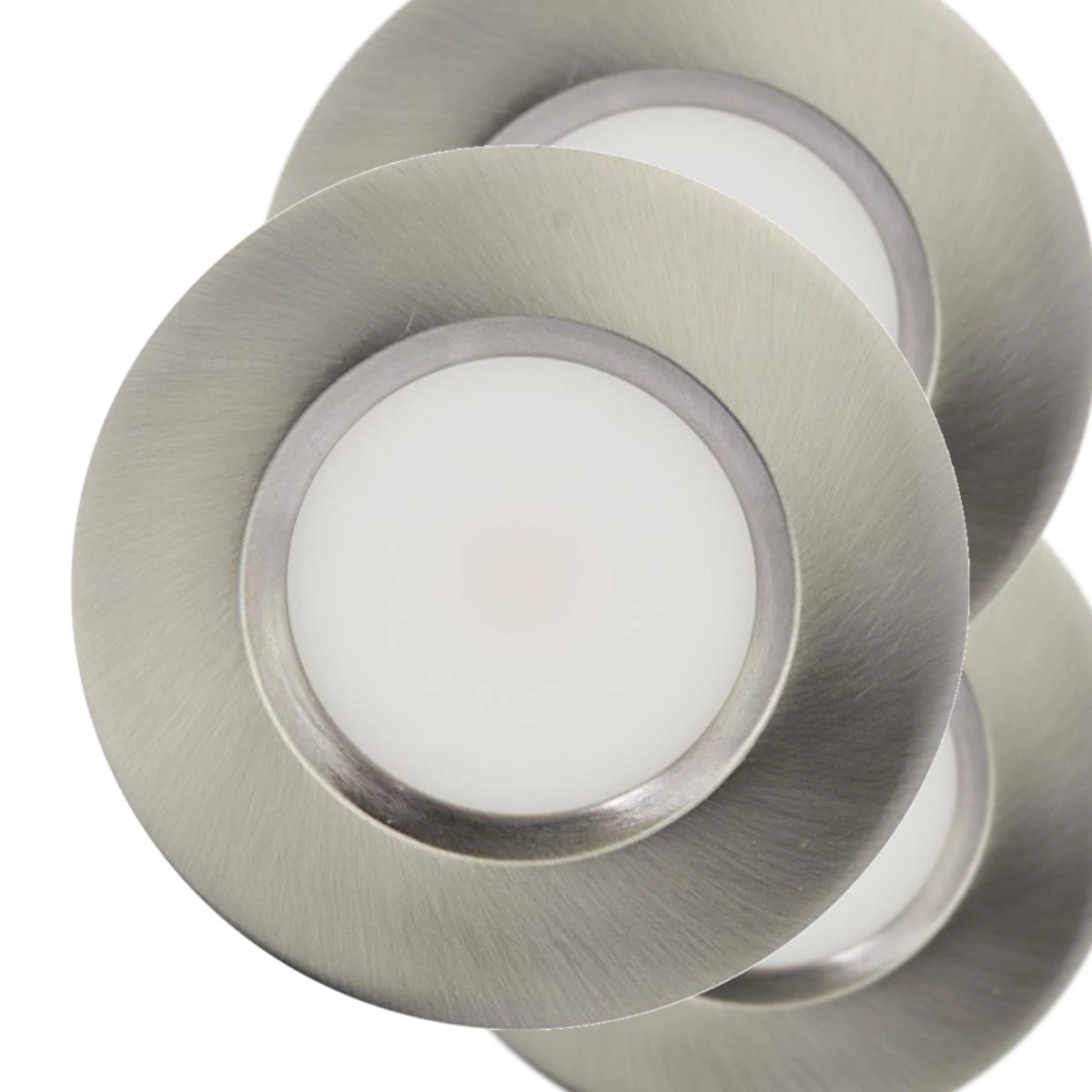 Die Einbauleuchte im Dreierset in der Ausführung nickel hat jeweils einen Durchmesser von 8,5cm und eine Gesamthöhe von 3,6cm wobei der erforderliche Durchmesser des Einbauloches 7,2cm beträgt. Gefertigt wurden die Leuchten aus Kunststoff und Metall von dem Leuchtenhersteller Nordlux.