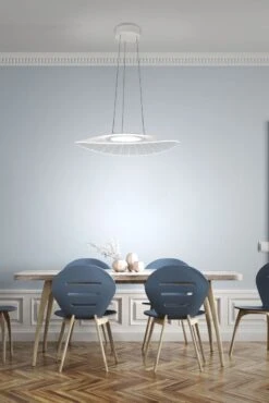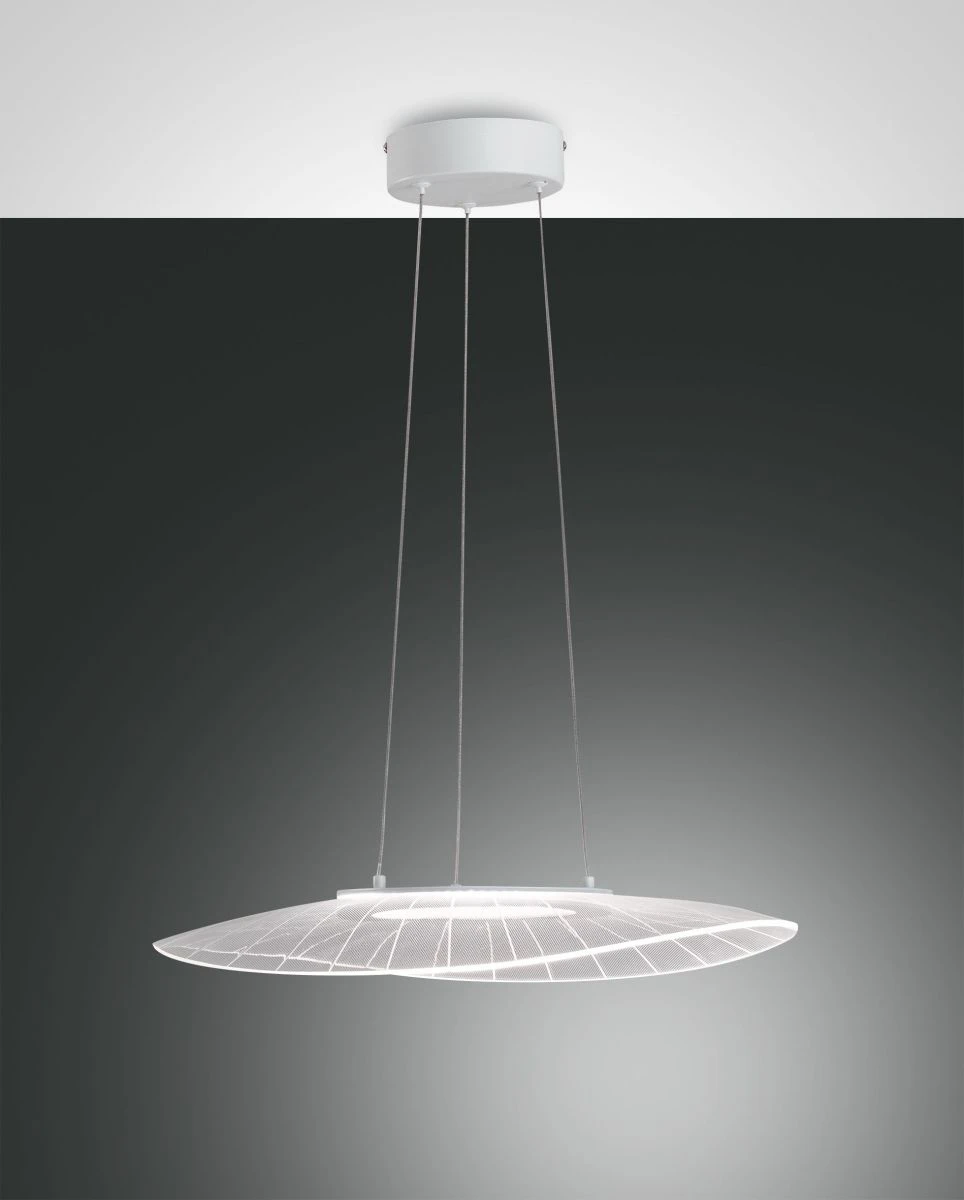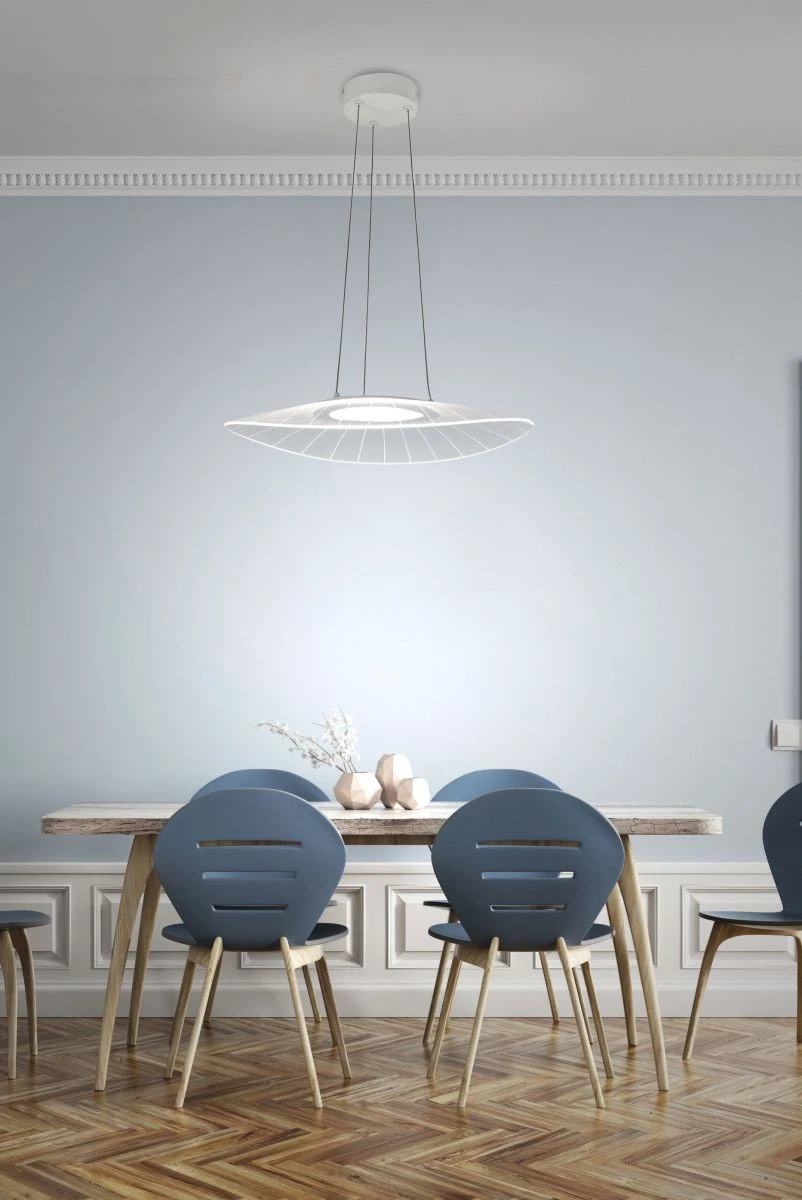 Die raffiniert gestaltete Pendelleuchte Vela von Fabas Luce zeichnet sich durch einen sanft geschwungenen ovalen Acrylschirm aus, welcher in der Mitte ein blendfreies LED verbirgt. Der in seiner größten Ausdehnung 590mm betragende weiß transparente Leuchtenschirm ist höhenverstellbar von 500 bis max. 2000mm. Dies ermöglicht eine optimale Ausleuchtung mit diffusem Licht und sorgt somit für eine gemütliche Wohnatmosphäre.