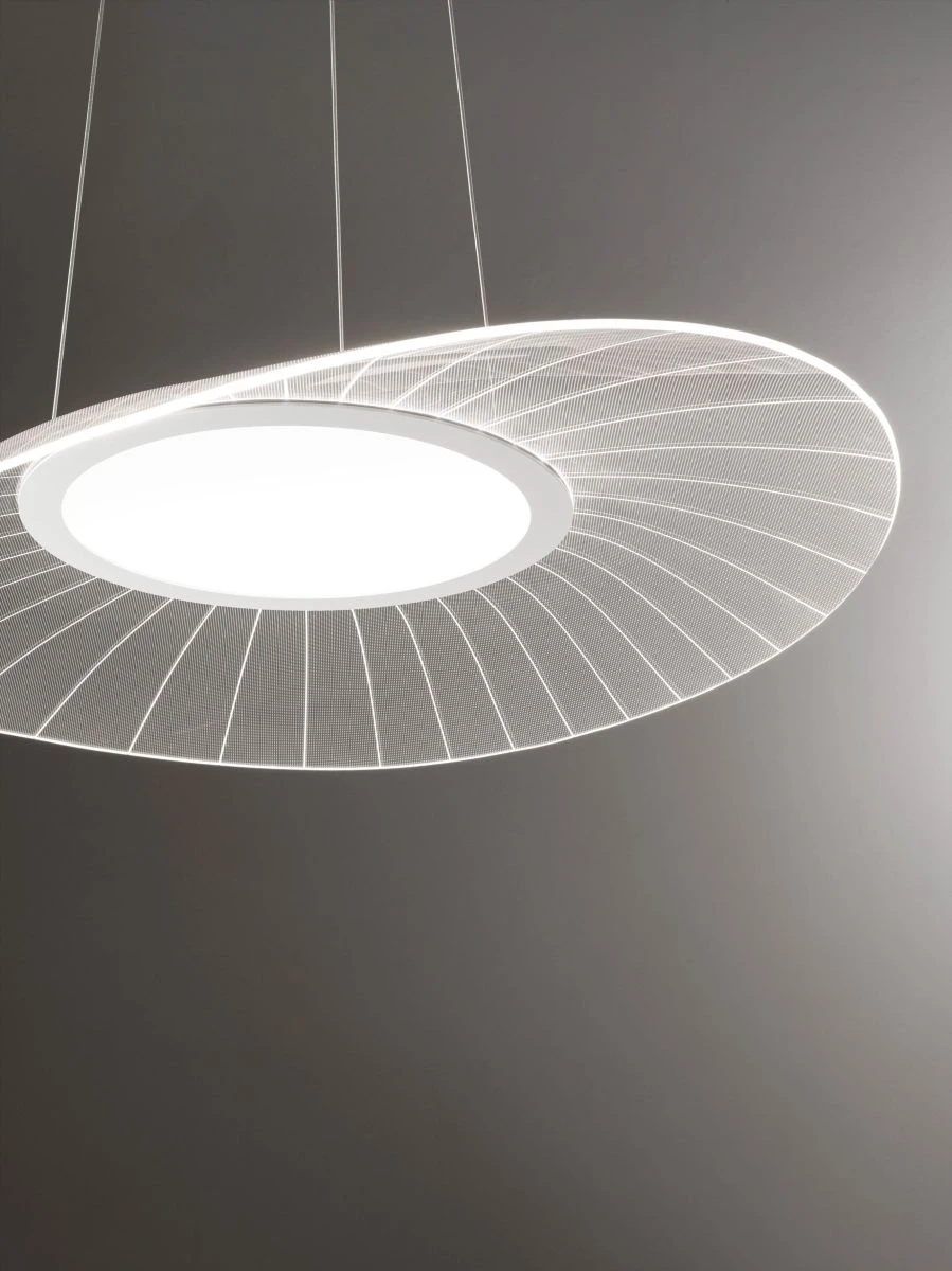 Die raffiniert gestaltete Pendelleuchte Vela von Fabas Luce zeichnet sich durch einen sanft geschwungenen ovalen Acrylschirm aus, welcher in der Mitte ein blendfreies LED verbirgt. Der in seiner größten Ausdehnung 780mm betragende weiß transparente Leuchtenschirm ist höhenverstellbar von 500 bis max. 2000mm. Dies ermöglicht eine optimale Ausleuchtung mit diffusem Licht und sorgt somit für eine gemütliche Wohnatmosphäre.