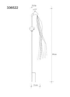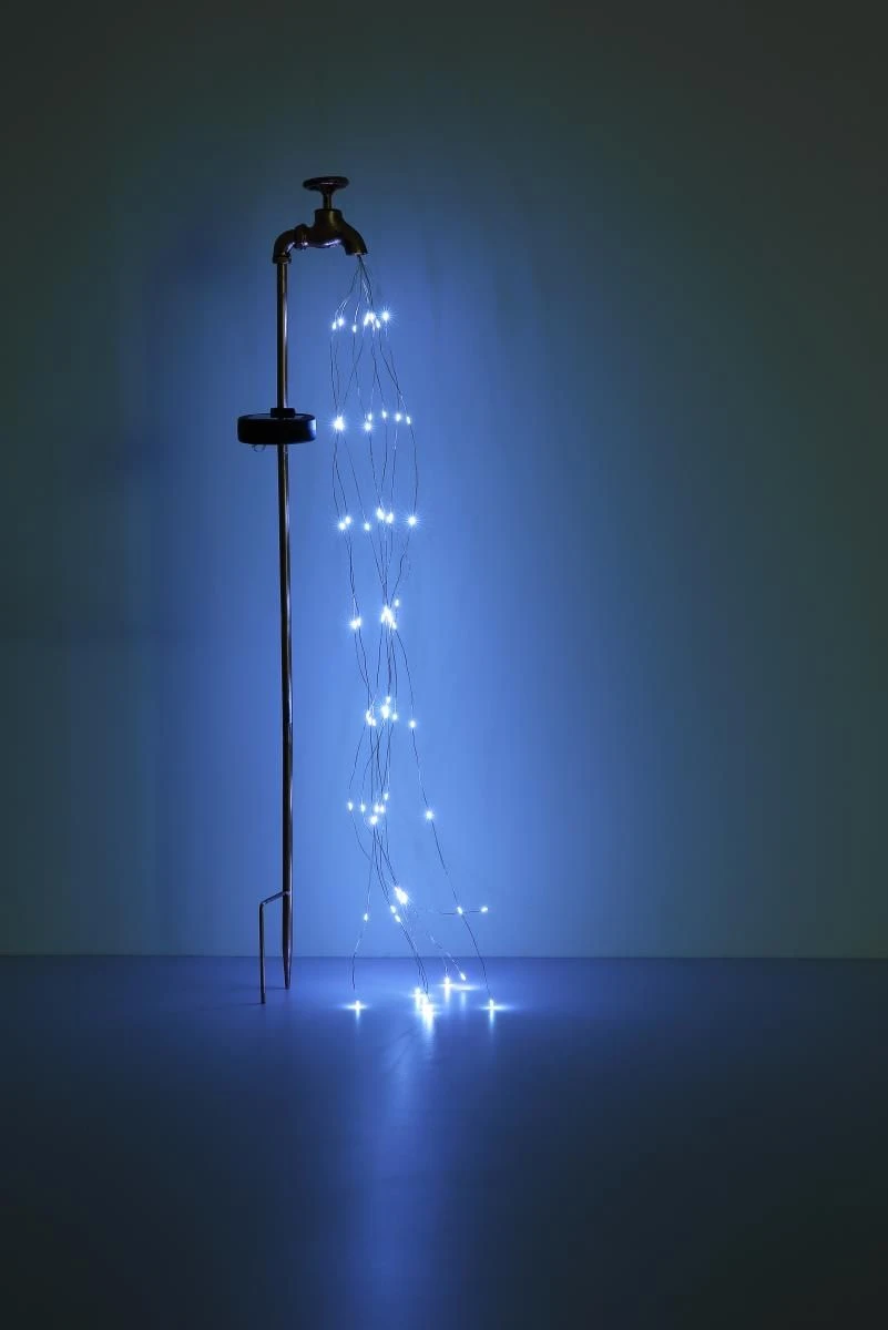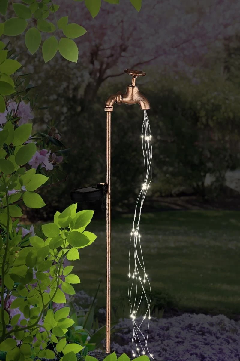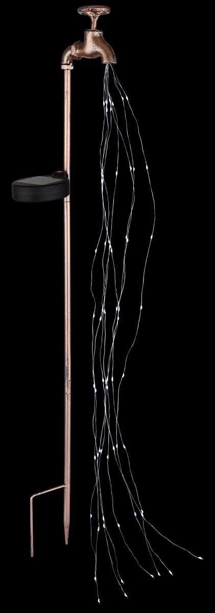 Auf einem Erdspieß befindet sich eine rose-goldfarbene Metallstange, die obenauf einen Wasserhahn präsentiert. Die Gesamthöhe dieser Solarleuchte ist 80cm. An der Öffnung des Wasserhahnes, an der eigentlich Wasser austreten sollte, befinden sich mehrere LED Lichterketten mit insgesamt 60 verbauten LED Leuchtmitteln mit Flackereffekt, welche 4500K neutralweißes Licht werfen.