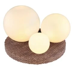 Präsentativ sind drei weiße Kunststoffkugeln in den Größen 8, 12 und 15cm auf einer braunen kreisförmigen Plattform mit 25cm Durchmesser angebracht.