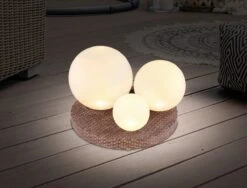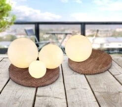 Die Solarlampe Rattan-Scheibe mit 3 Kugeln eignet sich wunderbar für Garten, Terrasse oder Balkontisch und verlängert mit ihrem Lichtschein Ihre lauen Sommerabende im Außenbereich.