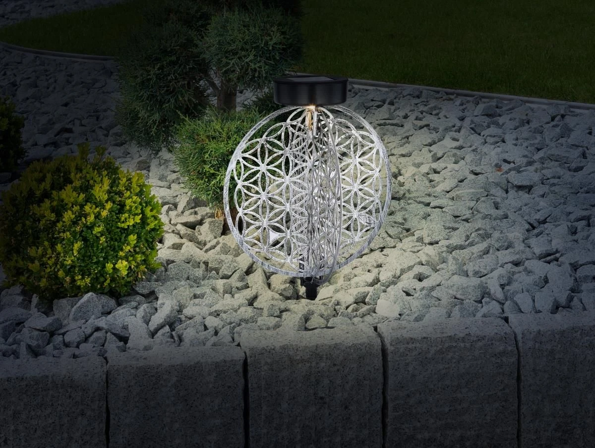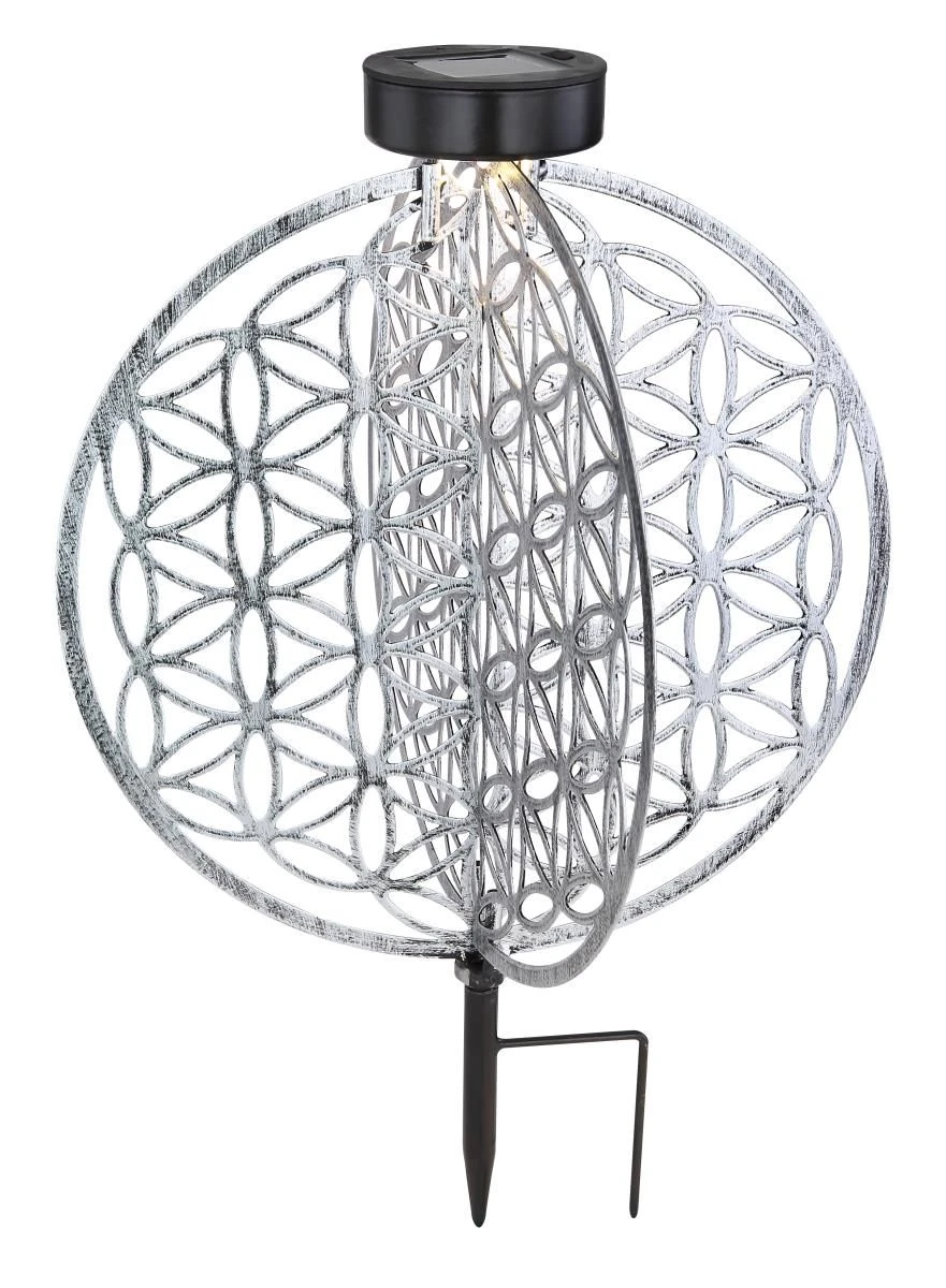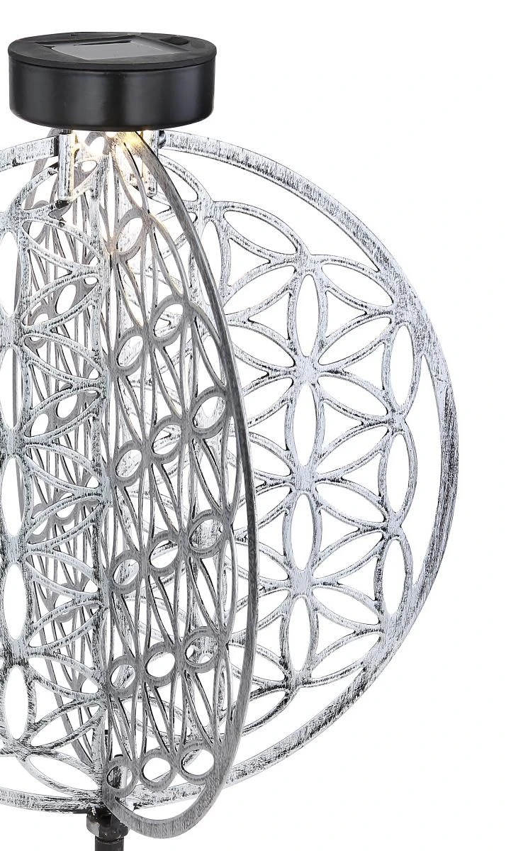 Verschönern Sie daher Ihren Garten mit dieser faszinierenden antik silberfarbenen LED Solarleuchte Scheiben mit Dekorstanzungen in Form der Lebensblume von Globo.