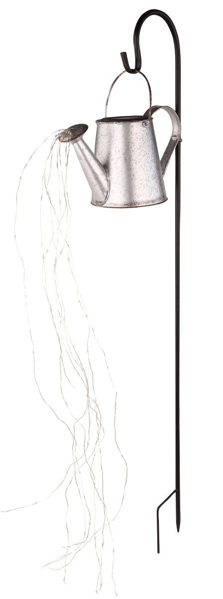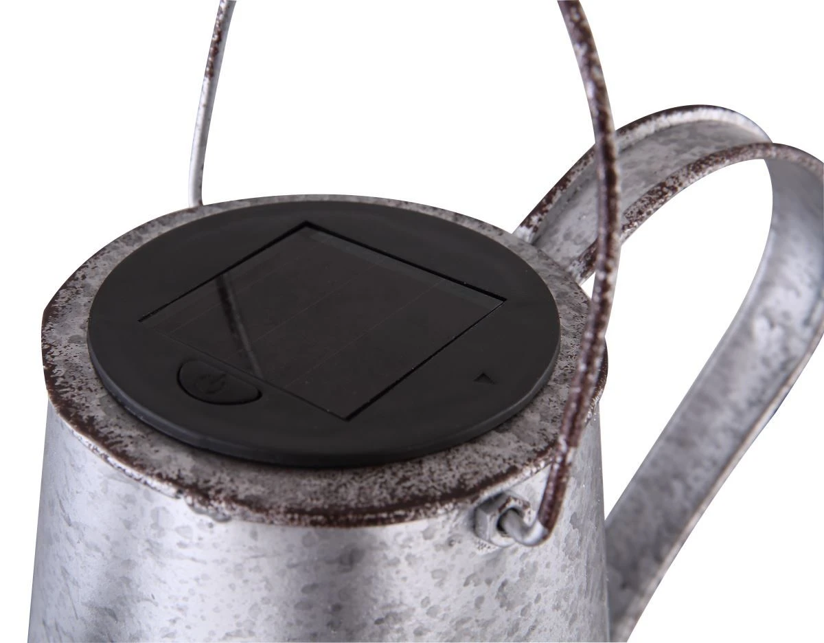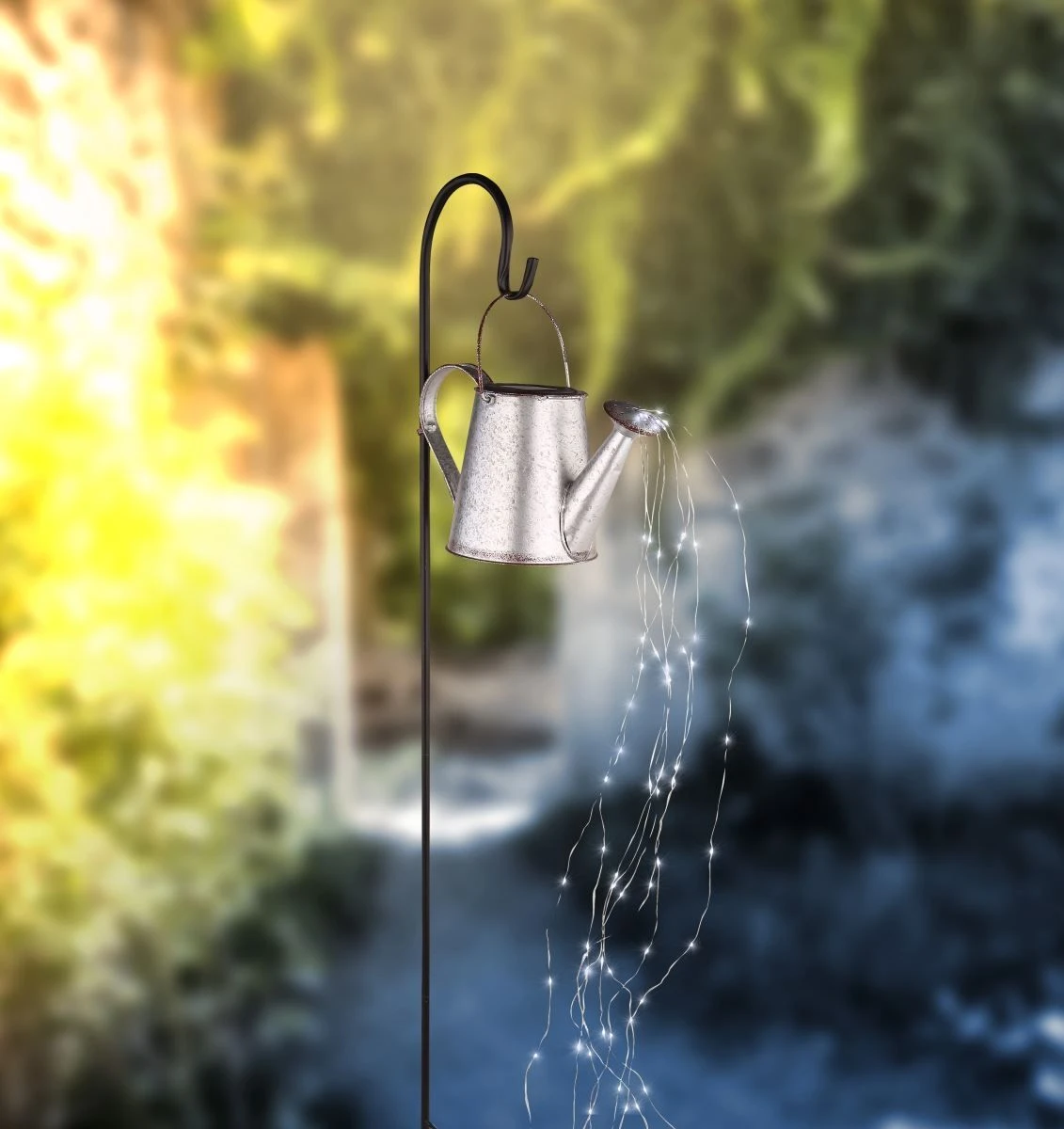 Sobald die Dämmerung eintritt und der Akku geladen ist beginnt das vermeintliche Gießwasser der Gießkanne flackernd zu leuchten.