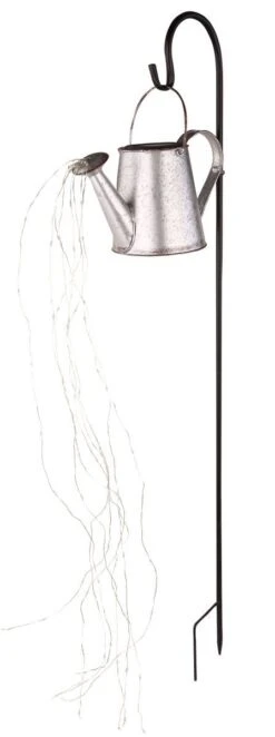 Setzen Sie den 112cm großen schwarzen Erdspieß aus Metall ganz einfach in den weichen Gartenboden und befestigen Sie die silbergraue Gießkanne aus Metall an dem dort vorgesehenen Haken.