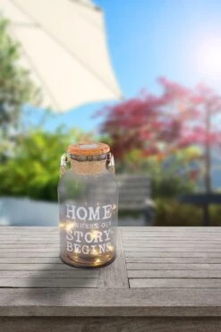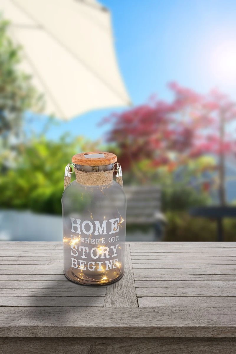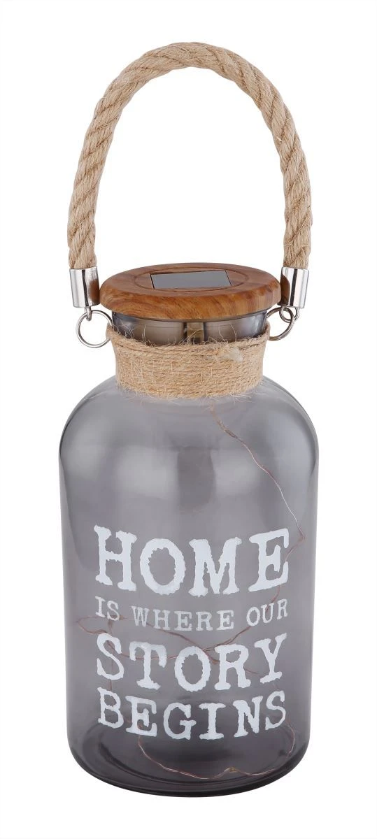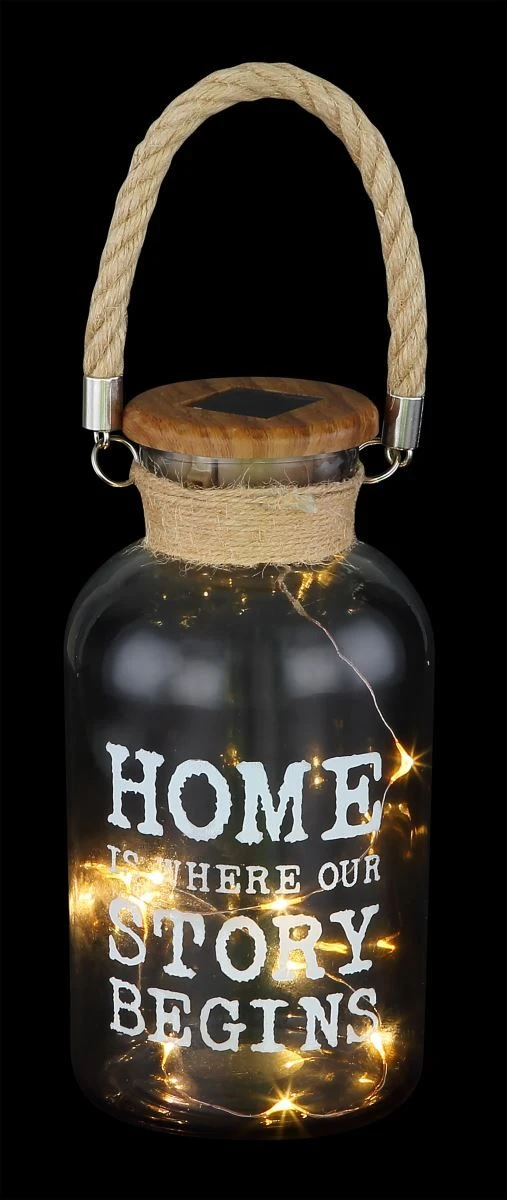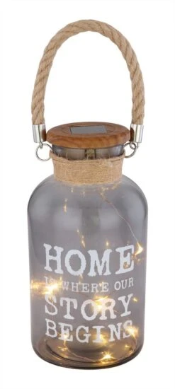 Zuhause ist, wo unsere Geschichte beginnt…. Ein wirklich liebevoller Spruch, welcher diese wundervolle Solarleuchte Glas mit Henkel schmückt – hier ins Englische übersetzt.