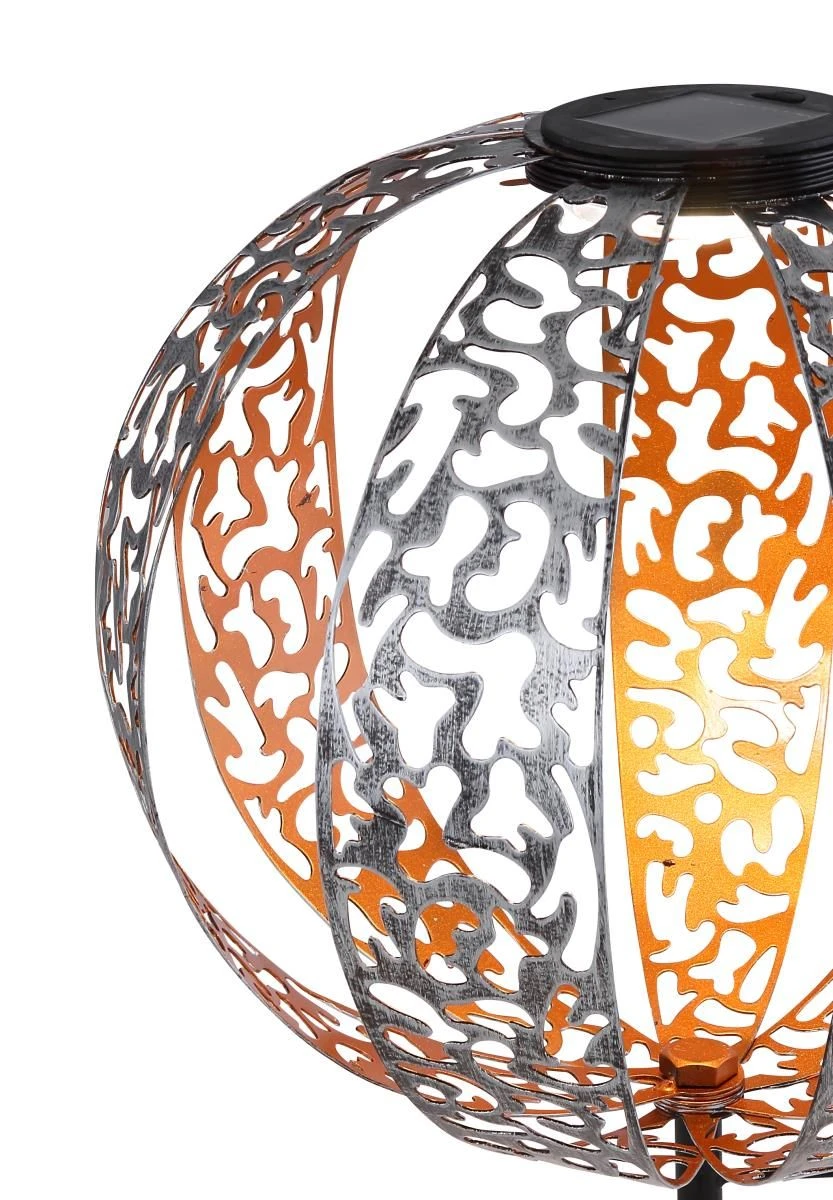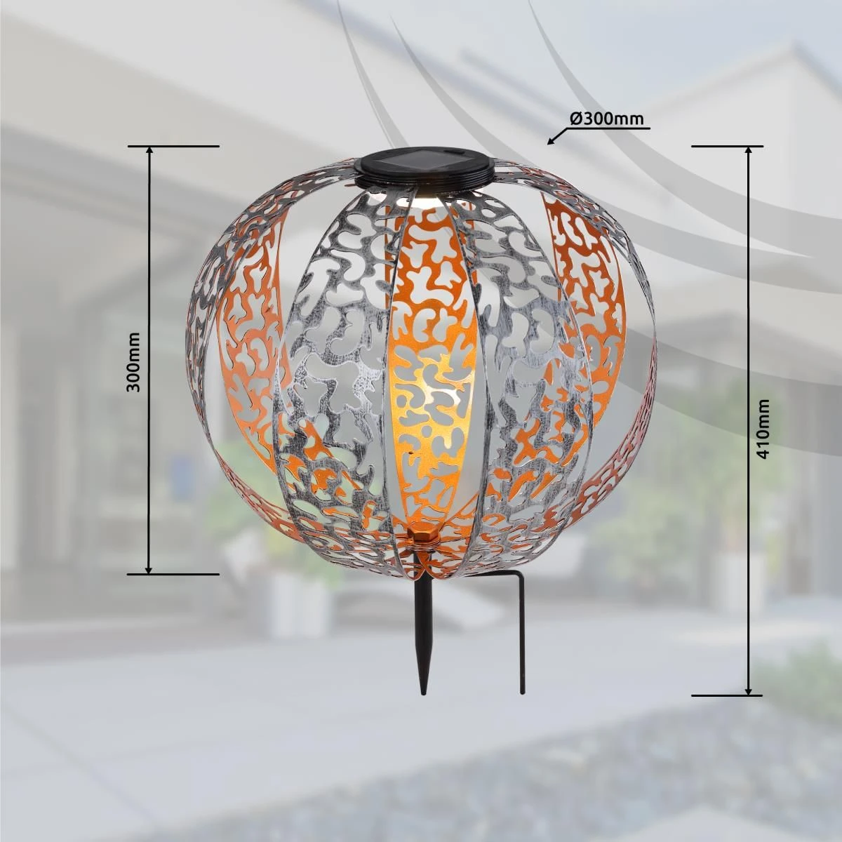 Das angenehm warmweiß leuchtende LED-Leuchtmittel scheint von oben auf das elegant ausgestanzte Muster der seitlich angebrachten Metallstreben, welche eine Kugel mit einem Durchmesser von 300mm bilden. Das Licht dringt duch das im Inneren der Kugel goldfarbene Metallgitter. Ab einsetzender Dämmerung eröffnet sich Ihnen somit ein beeindruckender Schattenwurf.