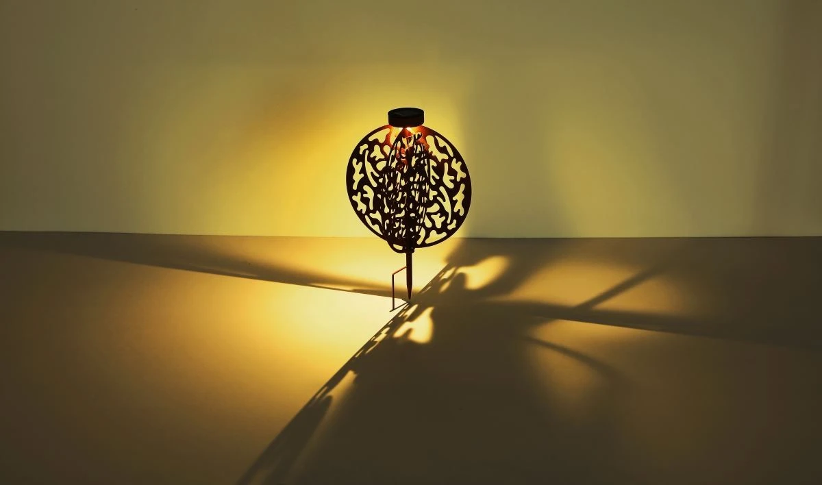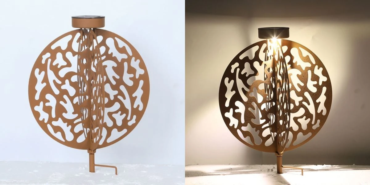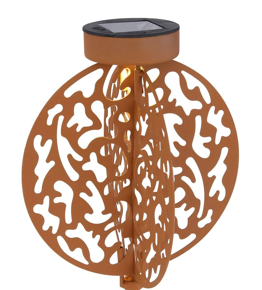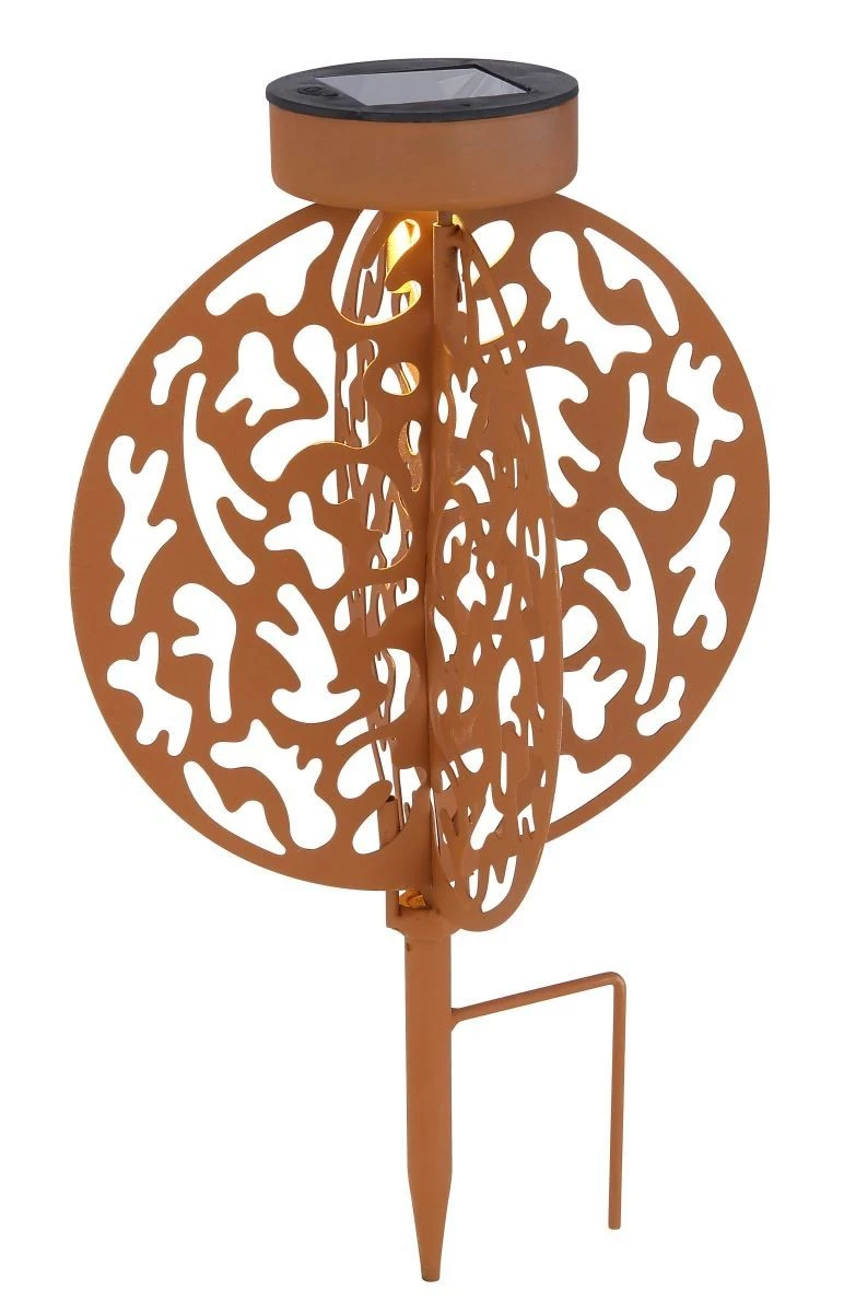 Verschönern Sie Ihren Garten mit Licht und dieser faszinierenden rostfarbenen LED Solarleuchte Scheiben im Kugel design mit Dekorstanzungen, welche bereits am Tage aufgrund des extravaganten Musters im Mittelpunkt steht.