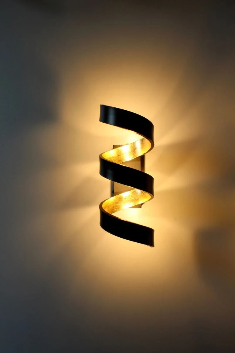 Die spiralförmige Wandleuchte Helix, macht Ihrem Namen alle Ehre. Die perfekt abgestimmten Windungen in Schwarz und Gold versprühen einen Hauch von Luxus und sorgen für faszinierende Lichteffekte. So wurden in die Windungen LEDs eingesetzt, die das Blattgold auf der Innenseite erstrahlen lassen. Das warmweiße Licht mit 3000 Kelvin, sorgt dabei für eine angenehme Atmosphäre.