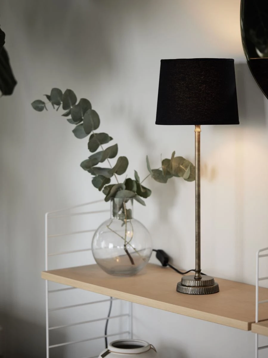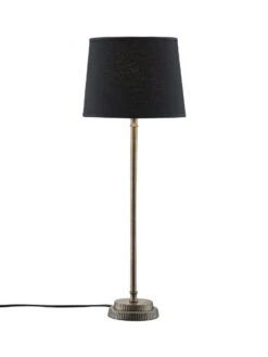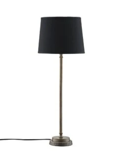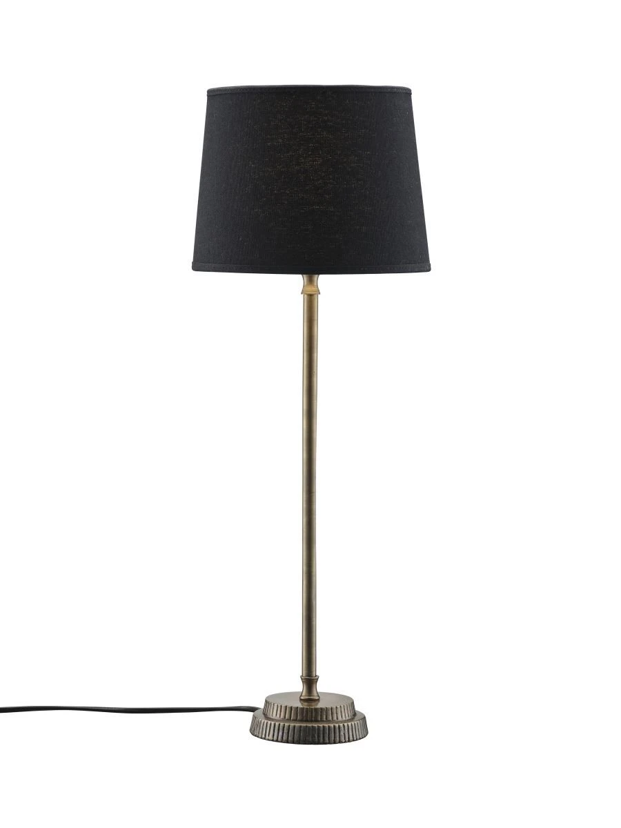 Mit einer Höhe von 58cm und einer Breite von 20cm besteht die Tischlampe Kent aus einen Lampensockel in antikem Messing und einem schwarzem Stoffschirm.