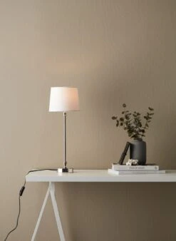 Mit einer Höhe von 59cm besteht die Tischleuchte Liam aus einen chromfarbenem Lampensockel und einem weißen Textilschirm. Diese Kombination verleiht der Leuchte ein elegantes Erscheinungsbild, welches jedem Raum einen strahlenden Glanz verleiht.