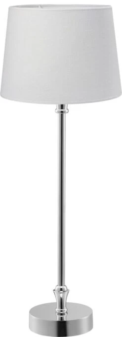 Mit einer Höhe von 59cm besteht die Tischleuchte Liam aus einen chromfarbenem Lampensockel und einem weißen Textilschirm. Diese Kombination verleiht der Leuchte ein elegantes Erscheinungsbild, welches jedem Raum einen strahlenden Glanz verleiht.