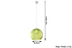 Ihr Name ist BALL. Die Kugel aus transparenten grünem Glas ist 300mmØ groß. . An der Kugel der Hängelampe ist eine passgenaue Aufhängung aus verchromten Metall angebracht. Die BALL hängt unauffällig und stilvoll über ihrem Einsatzort . Doch wird Sie mit Strom versorgt ist BALL präsent und beleuchtet mit 1 Flamme und max.60W ziemlich jeden Raum. Dank eines dimmbaren Leuchtmittels verbreitet BALL romantisches,weiches oder helles Licht . Einsatz findet die BALL in jedem Wohnraum ob Küche, Wohnzimmer, Kinderzimmer oder in Cafe’und Bar. Durch das Pendel von 800mm Länge ist die Aufhängung auch in verschiedenen Bereichen möglich. Die E27 Fassung macht die Wahl der Leuchtmittel dabei auch einfach und umfangreich. Die BALL gibt es hier auch in verschiedenen Farbvarianten um vielen Wünschen gerecht zu werden.