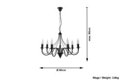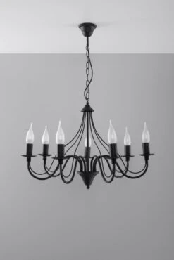 Die Sollux MINERWA ist ein schlichter Kronleuchter für klassisches Ambiente. Die 7 Flammen können durch die E14 Fassungen mit 7x 40W bestückt werden. Der Durchmesser von 60cm bietet eine sehr gute Lichtverteilung. Die max.Kettenlänge der Aufhängung lässt die MINERWA 80cm unter der Decke schweben.Von Romantik bis zum gut ausgeleuchtetem Raum ist vieles möglich. Die asymetrischen Arme der Hängelampe aus Metall machen Sie zum Einzelstück über dem Esstisch ob im Rittersaal oder der heimischen Küche. Die Materialien zeigen auf welche Handwerkskunst hinter der Herstellung steht. An jeder Decke ob Küche, Wohnzimmer, Schlafzimmer oder Flur macht diese Lampe eine gute Figur. Mit Phantasie eröffnen sich auch märchenhafte Möglichkeiten für Kinderzimmer, wobei es immer um die Beleuchtung zum wohlfühlen geht.